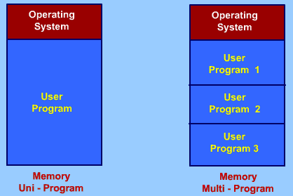 In uniprogramming system, only one program is in execution. After complition of one program, another program may start.