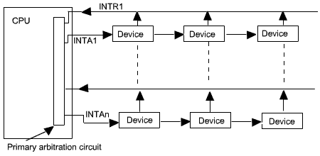 In one interrupt line, more than one device can be connected in daisy chain fashion. The High priorities devices should be connected to the interrupt lines that has got higher priority.