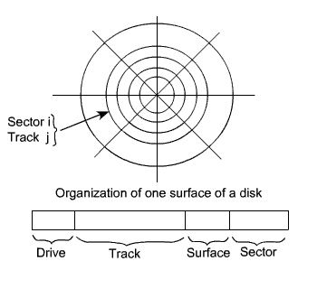 The organization of data on a disk and its addressing format is shown in the Figure 7.10. Figure 7.10: Organization of one surface of a disk
