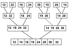 We can assume each element in a given array as a sorted sub array.Take adjacent arrays and merge to obtain a sorted array of two elements. Next step, take adjacent sorted arrays, of size two, in pair and merge them to get a sorted array of four elements. Repeat the step until whole array is sorted. Following figure illustrates the procedure. |