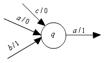 Hence: , proving the equivalence as defined. Note that, to construct an equivalent Moore machine from a Mealy machine we cannot adopt the reverse process given in the above constructions i.e. simply push the output associated with a transition to the state (where this, transition leads to) to be considered as the output produced by the state. This is because, there may be two transitions going to a state with different outputs associated with it as shown below.