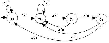 Example 3 : The equivalent Mealy machine for the Moore machine given in example 1 is produced below.