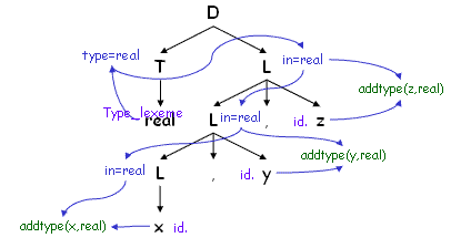The figure shows the dependency graph for the statement real id1, id2, id3 along with the parse tree. Procedure calls can be thought of as rules defining the values of dummy synthesized attributes of the nonterminal on the left side of the associated production. Blue arrows constitute the dependency graph and black lines, the parse tree. Each of the semantic rules addtype (id.entry, L.in) associated with the L productions leads to the creation of the dummy attribute.