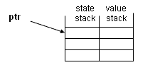 Synthesized attributes are evaluated using the attributes of the children nodes only. So in a bottom up evaluation, if the attributes are maintained on a stack then the attributes of nodes higher up in the parse tree can be evaluated. The stack is extended to hold the state as well as the value. Top of the stack is maintained in a location pointed by the pointer top.