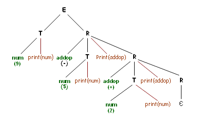 In a translation scheme, as we are dealing with implementation, we have to explicitly worry about the order of traversal. We can now put in between the rules some actions as part of the RHS. We put this rules in order to control the order of traversals. In the given example, we have two terminals (num and addop). It can generally be seen as a number followed by R (which necessarily has to begin with an addop). The given grammar is in infix notation and we need to convert it into postfix notation. If we ignore all the actions, the parse tree is in black, without the red edges. If we include the red edges we get a parse tree with actions. The actions are so far treated as a terminal. Now, if we do a depth first traversal, and whenever we encounter a action we execute it, we get a post-fix notation. In translation scheme, we have to take care of the evaluation order; otherwise some of the parts may be left undefined. For different actions, different result will be obtained. Actions are something we write and we have to control it. Please note that translation scheme is different from a syntax driven definition. In the latter, we do not have any evaluation order; in this case we have an explicit evaluation order. By explicit evaluation order we have to set correct action at correct places, in order to get the desired output. Place of each action is very important. We have to find appropriate places, and that is that translation scheme is all about. If we talk of only synthesized attribute, the translation scheme is very trivial. This