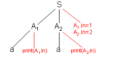 We have a problem when we have both synthesized as well as inherited attributes. For the given example, if we place the actions as shown, we cannot evaluate it. This is because, when doing a depth first traversal, we cannot print anything for A1. This is because A1 has not yet been initialized. We, therefore have to find the correct places for the actions.