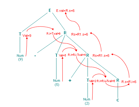 For top-down parsing, we can assume that an action is executed at the time that a symbol in the same position would be expanded. Thus, in the second production in Fig. 2., the 1st action (assignment to R1:i) is done after T has been fully expanded to terminals, and the second action is done after R1 has been fully expanded. Also, as discussed in the previous lecture, for an L-attributed translation an inherited attribute of a symbol must be computed by an action appearing before the symbol and a synthesized attribute of the non-terminal on the left must be computed after all the attributes it depends on, have been computed.