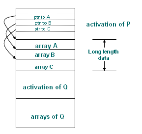 The procedure P has three local arrays. The storage for these arrays is not part of the activation record for P; only a pointer to the beginning of each array appears in the activation record. The relative addresses of these pointers are known at the compile time, so the target code can access array elements through the pointers. Also shown is the procedure Q called by P . The activation record for Q begins after the arrays of P. Access to data on the stack is through two pointers, top and stack top. The first of these marks the actual top of the stack; it points to the position at which the next activation record begins. The second is used to find the local data. For consistency with the organization of the figure in slide 16, suppose the stack top points to the end of the machine status field. In this figure the stack top points to the end of this field in the activation record for Q. Within the field is a control link to the previous value of stack top when control was in calling activation of P. The code that repositions top and stack top can be generated at compile time, using the sizes of the fields in the activation record. When q returns, the new value of top is stack top minus the length of the machine status and the parameter fields in Q's activation record. This length is known at the compile time, at least to the caller. After adjusting top, the new value of stack top can be copied from the control link of Q.