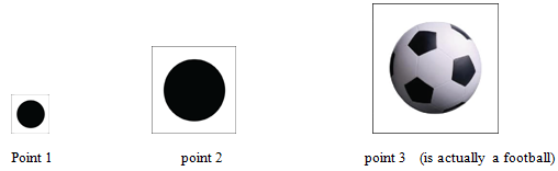 A form may be recognized as a point if it is small. The smallness here is completely relative as any form may appear huge as compared to any tiny frame may appear huge or they depending on the frame of reference but the same form may appear large when it is put into a much greater frame of reference. As an example shown below a point can be a football if we go closer to the point or in other words, if we zoom it, the point may appear as a football visually (Fig.3). The most common shape is that of a circle which has features like non-directional, non-angular, compact and simple. However, a point may also be a square, triangle, oval or even an irregular shape (Fig.4). Thus, the features of a point are: it should be comparatively small and its shape should be simple.
