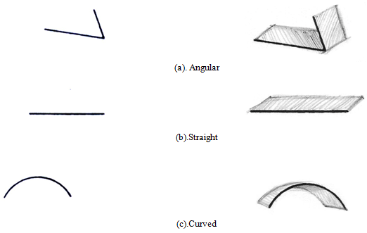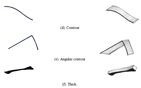 The line is one of the very important basic elements of deign The various shapes of form to understand the various structural characteristics are shown in (fig. 6) an angular line has its own dimension as form. Here by adding width to the 2 dimensional lines, how we perceive 3dimensional structure (form) of the line. Likewise showing the structures of various lines such as straight, curved, angular contour in order to understand the visual characteristics of 3 dimensional forms and its structure could be perceived from various lines. The thickness of the line also determines the volume of the structure as shown bellow.