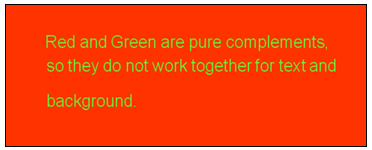 Red and Green are pure complements, so they do not work together for text and background. They create noise and fight with each other. Therefore readability decreases. This should be checked out by using other set of complimentary colour. See how two complementaries reduced readability (fig.153)