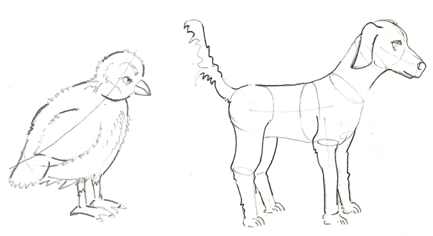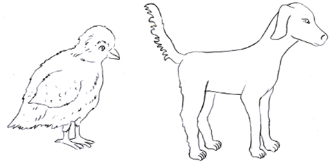 And when the forms are drawn, the backside of the dog and chick are indicated. Even though we cannot see all sides in the finished drawing, the subject should appear three-dimensional. Therefore, one should have proper knowledge of planes and volume of an object. To finish the drawing, we simply refine the outlines and add a little fluffy texture to the downy chick see fig.71 (a) and (b).