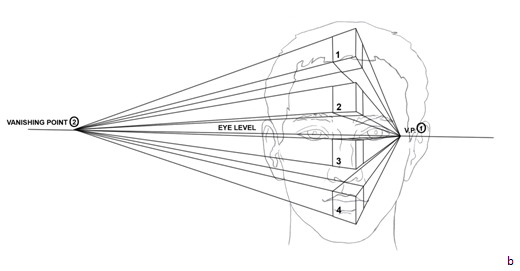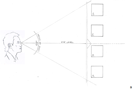 The eye level not only dictates but is synonymous with the vanishing line for horizontal lines fig.98, a,b.