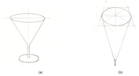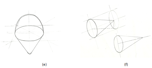 Drawing cones is similar to the drawing of cylinders; the centre line of a cone is also the extension of the axis of the ellipse related with the cone. It usually lies at right angle to the ellipse's major axis, and it connects to the ellipse not at the ellipse's centre point, but behind it.