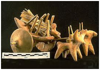 Handcrafted toys have a long history in Indian subcontinent. As old as 5000 years back in Indus Valley Civilization number of recreational toys are found, this reflects their concern about children’s welfare. Indus Valley has produced large number of animated terra-cotta toys. A few wheel operated terra-cotta bullock cart (plate 8A) toys are found in Mohan-jo-daro and Harappa. Animated animals made in terra-cotta (plate 8B) are quite matured in term of their artistic quality. Bronze and copper metal are used for various household items. Metal toys of chariot (plate 8C) exhibits their excellence in creating such matured design. Along with this the Torso Figures with movable limbs are examples of excellent examples of ball-socket mechanism.