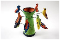 Toys in human society plays extremely significant role since it is mostly related to children’s mental and physical growth. Each toy is responsible in overall development of a child. A group of colorful birds (plate 13A) are surrounding a vase are attached by flexible wire. The flexible wires are creating dynamic movement and animated gestures. The interaction between the toy and the child creates an intimate emotional relationship. Thus, it helps a child to find his/ her own world of imagination. The craftsmanship with the common local material (clay, color, wire, etc.) creates bonding between the toy and the child. The design of the handcrafted toy does not display the best craftsmanship in term of shape and forms. The modern toy (plate 13B) has the perfect machining display in term shape, form, color and appearance. The glossy effect of plastic material gives feeling of typical mass produced products. Because of the modern material consideration the engine is more durable and strong. It is not going to perish so easily like a handmade toy. Puppet (plate 13C) making craft has a long history in the Indian subcontinent. In rural areas with the help of puppet it entertains village folks. The animated gesture and the storyboard puppetry conveys valuable message to the mass. Making of puppet is based on their specific character in term of clothing, expression for communication with the mass. It is a powerful communication medium which works in various layers. Rural areas have developed their own mode of communication and entertainment values, where handmade puppets play important role.