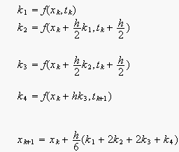 The Runge-Kutta 4th order algorithm uses intermediate points in an interval of duration h to calculate the state xk+1 from xk as follows: