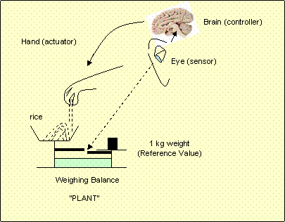 Let us suppose that you wish to buy 1 kg of rice from your grocer. If all rice grains were of the same weight, it would be possible (although by a very tedious process!) to calculate how many grains are required. However, not only will this be time consuming, but it is also true that there are uncertainties in the grain weight. Therefore, rather than follow this procedure the grocer will put some rice into his weighing pan (counter balanced by 1 kg standard weight) and depending on the extent of imbalance, he will incrementally add or reduce grain in the pan. A seasoned grocer may even hold some grain in his fist and gradually pour it by monitoring the position and rate at which the pan moves. By doing this, he can speed up the process of weighing the rice. This is a manual feedback control system. The major components are shown below: