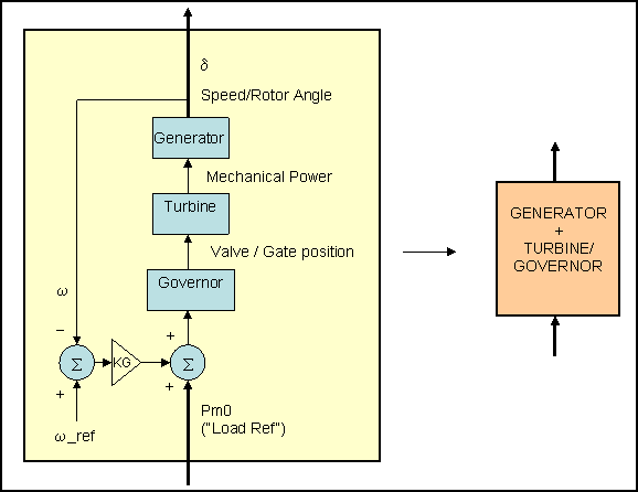 Each generator which has a governor can be represented as follows. Note that the value of the load reference Pm0 is adjusted by AGC.