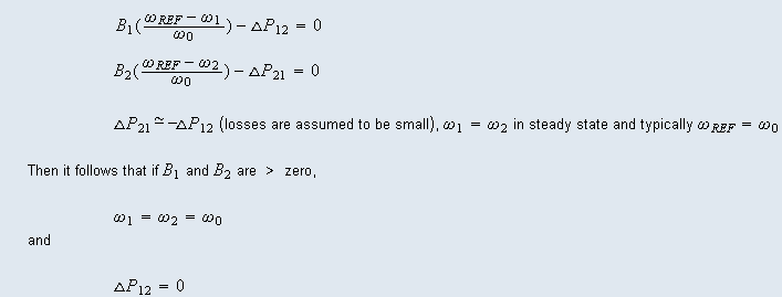 An integral controller acts on this error to change the load reference of both governors. Since an integral controller drives its input to zero in steady state (why?), it follows that in steady state: