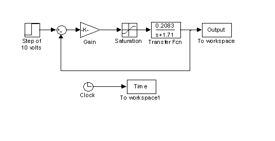 Figure M4.6 is the simulation diagram of a feedback control system: the amplifier gain is 100 and the transfer function of the motor is 0.2083/(s +1.71). We assume the amplifier of gain 100 saturates at +5 or -5volts. The result of the simulation is shown in Fig. M4.7.