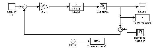 minutes. The measurement noise parameters we have used are: mean of 0, variance of 0.5, initial seed of 61233, and sample time of 0. The simulink inputs a step of 30 to the system (Fig. M4.8). Deadtime block in this figure is Transport Delay block from Continuous library, and Random Number block is from Sources library.