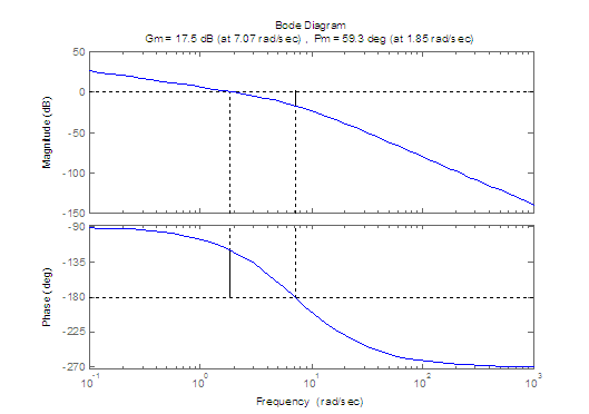 The gain margin and phase margin can be obtained from the Bode plot of G(s)H(s). The Bode plot and the performance measures generated by the command margin(G*H) are shown in Fig. M9.2.