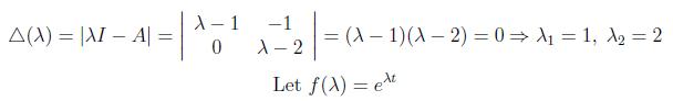 To derive the discrete state space model, let us first compute the state transition matrix of the continuous time system using Caley Hamilton Theorem.