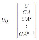 Definition 2 The state model (1) (or the pair (A,C) ) is said to be observable if any initial state x(0) can be uniquely determined from the knowldge of output y(k) and input sequence u(k), for , where N is some finite time. Otherwise the state model (1) is unobservable.