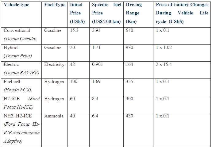 For the Honda FCX the listed initial price for a prototype leased in 2002 was USk$2,000, which is estimated to drop below USk$100 in regular production. Currently, a Honda FCX can be leased for 3 years with a total price of USk$21.6. In order to render the comparative study reasonable, the initial price of the hydrogen fuel cell vehicle is assumed here to be USk$100. For e lectric vehicle, the specific cost was estimated to be US$569/kWh with nickel metal hydride (NiMeH) batteries which are typically used in hybrid and electric cars.