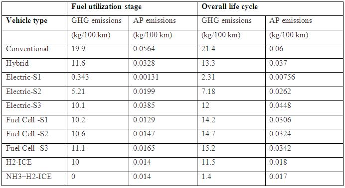 The environmental impact of the fuel utilization stage, as well as the overall life cycle is presented in Table 4. The H2-ICE vehicle results were based on the assumption that the only GHG emissions during the utilization stage were associated with the compression work, needed to fill the fuel tank of the vehicle. The GHG effect of water vapor emissions was neglected in this analysis due its little value,. For the ammonia fuel vehicle, a very small amount of pump work was needed therefore, ammonia fuel was considered to emit no GHGs during fuel utilization.