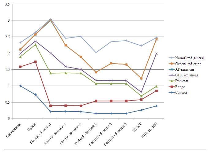 Figure2: Normalized economic and environmental indicators for six vehicle types