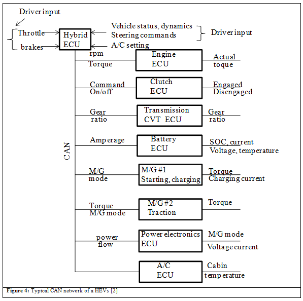A typical CAN network in an HEV is shown in Figure 4 . The CAN is a fast, high rate network enabling communication between ECUs. In CAN most data can be updated every 10ms and the data is checked to assure data reliability.