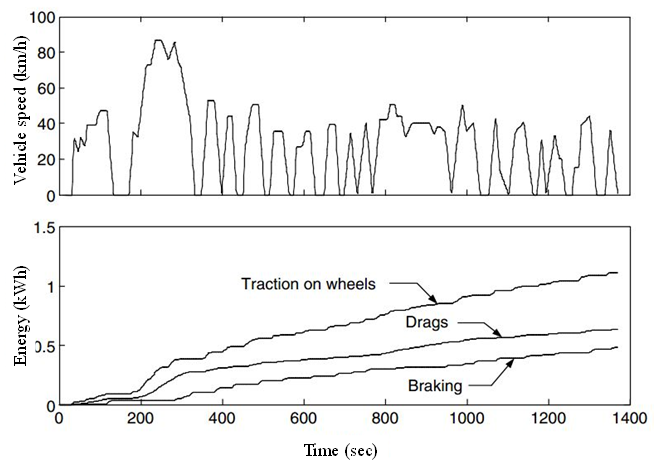 Figure 2: Total traction energy and energies consumed by drags and braking in an FTP 75 urban