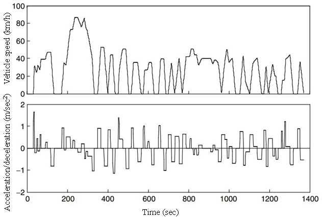 Figure 3: Vehicle speed and acceleration/deceleration in an FTP urban drive cycle [1]