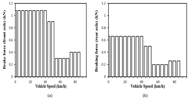 Figure 4: Braking force vs. vehicle speed in an FTP 75 urban drive cycle: (a) on front wheels and (b)