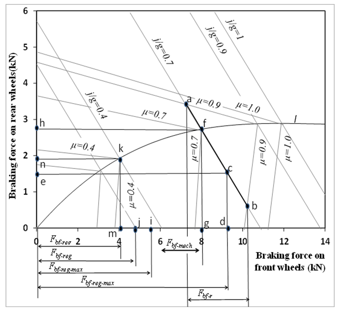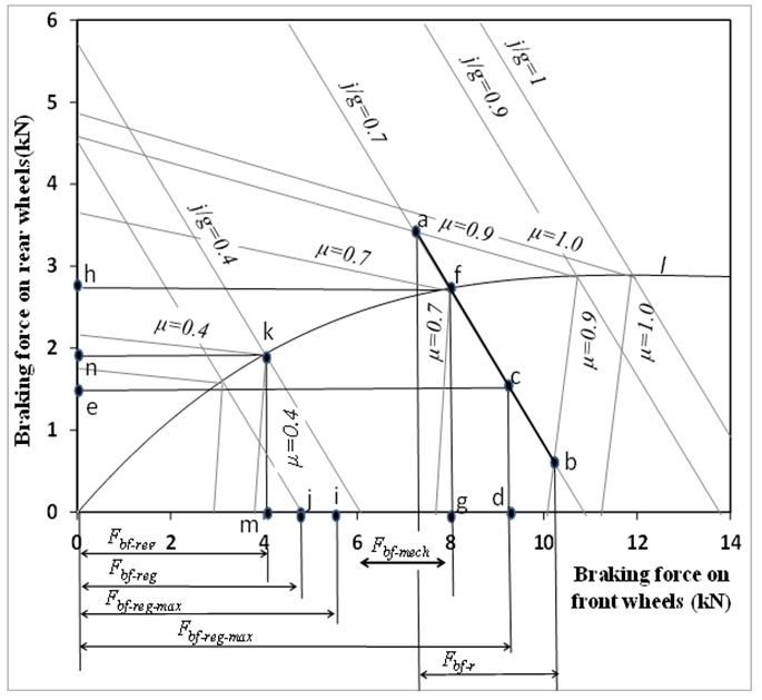 When the commanded deceleration rate, j/g, is equal to the road adhesive coefficient μ, the operating point of the front and rear braking forces must be on the curve I. On a road with a high adhesive coefficient ( μ=0.7 , operating point ƒ, in Figure 2 , for example), the maximum regenerative braking force is applied and the remaining is supplied by the mechanical brake. On a road with a low adhesive coefficient (μ=0.4 , operating point k, in Figure 2 , for example), regenerative braking alone is used to develop the front braking force.