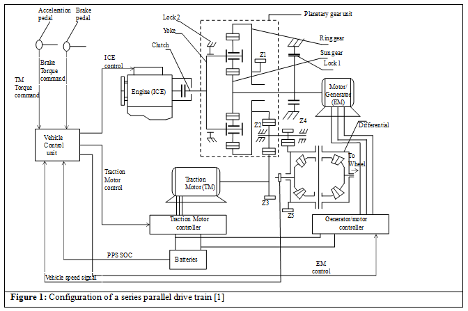 A typical series-parallel HEV drivetrain configuration is shown in shown in Figure 1 . The various connections in this drivetrain are as follows:
