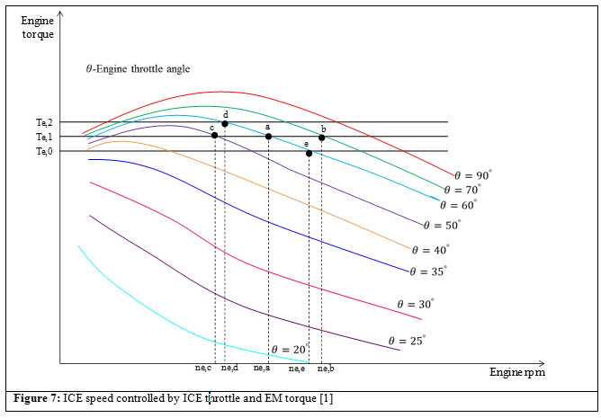 From the above discussion it can be seen that the ICE speed can be controlled within its optimal speed range by instantaneously controlling the engine throttle angle and/or the EM torque.