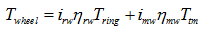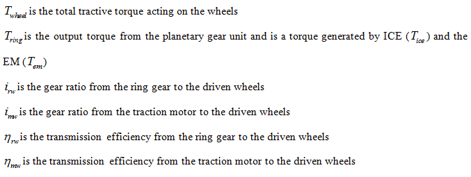 The traction torque on the driven wheels is the sum of the torques transmitted from the ring gear of the planetary gear units and the traction motor. The traction torque on the driven wheels can be expressed as