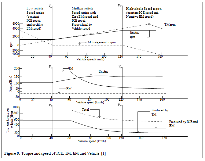 - At low speeds the ICE operates at constant speed and the EM operates with positive speeds
