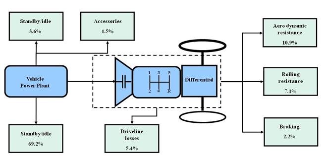 - At best, only 20% of the fuel energy reaches the wheels and is available to overcome the tractive forces, and this is on the highway when idling losses are at a minimum, braking loss is infrequent, and shifting is far less frequent.