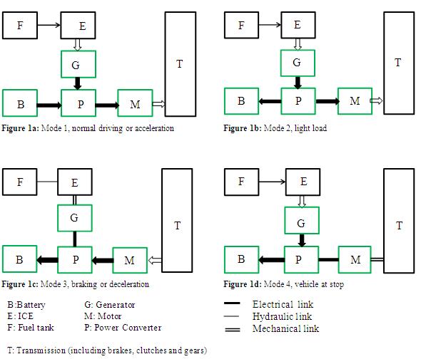 In the series hybrid system there are four operating modes based on the power flow: