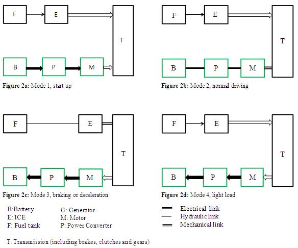 - Mode 1: During start up or full throttle acceleration (Figure 2a) ; both the ICE and the EM share the required power to propel the vehicle. Typically, the relative distribution between the ICE and electric motor is 80-20%.