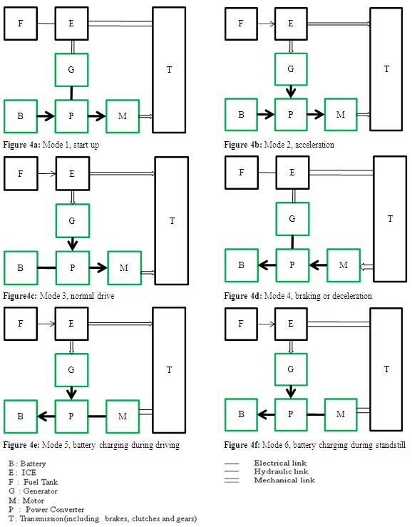 • Mode 6: When the vehicle is at standstill (Figure 4f), the ICE can deliver power to charge the battery via the EM