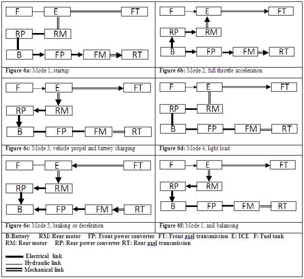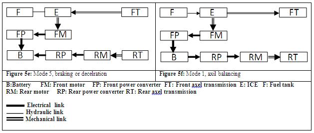 In Figures 6a-f all the six modes of operation of front electric and rear hybrid are shown.
