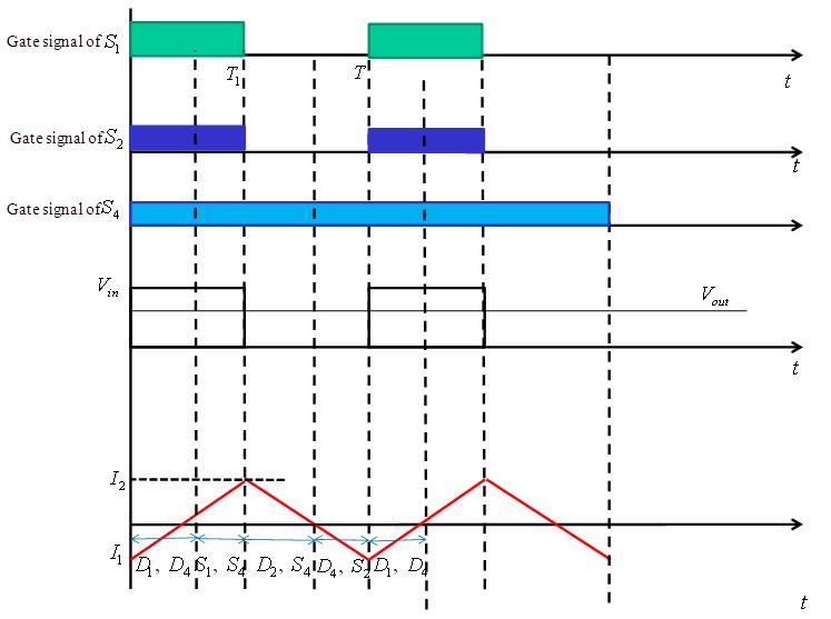 • Mode 2: When S2 is turned off at , the inductor continuous to drive the current in the reverse direction through S3 and D1 ( Figure 5b ).