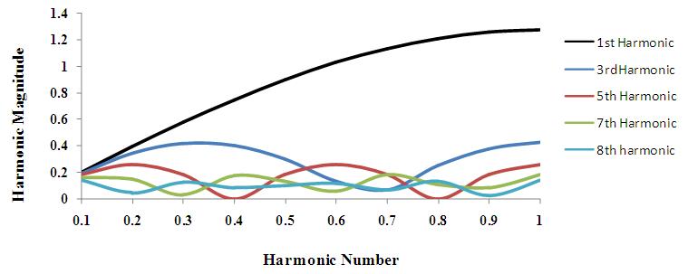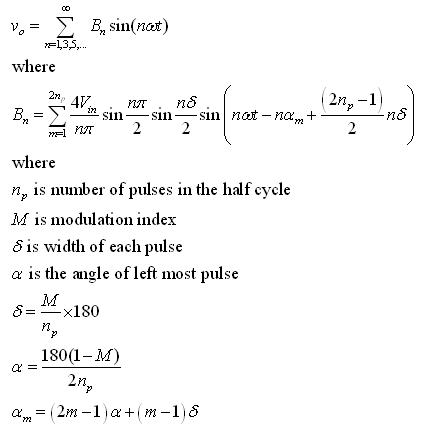 The harmonic content in the voltage vo can be reduced by using several pulses in each half cycle. The generation of the gating signal is done by comparing a reference signal with a triangular carrier waveform ( Figure 5 ). The generated gate signals are shown in Figure 5 . The frequency of the reference signal fr and the carrier signal fc determine the number of pulses per half cycle ( np) as