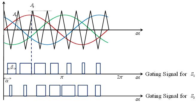 The generation of gating signals for a three phase DC-AC inverter with sine PWM are shown in Figure 8 . There are three sinusoidal reference waves (vra , vrb , vrc) each shifted by 120° . A triangular carrier wave is compared with the reference signals to produce the gating signals. Comparing the carrier signal vcr with the reference phases vra , vrb , vrc produces the signals for gates 1, 2 and 3 (g1, g2, g3). The instantaneous line-to-line output voltage is