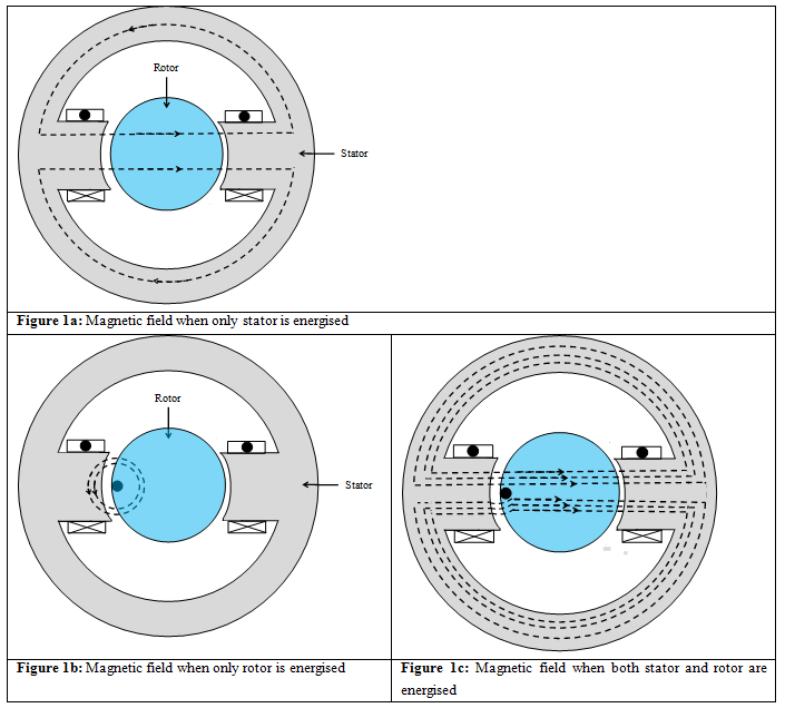 Another configuration of the motor, with the flux lines, is shown in Figure 2a . Since the magnetic flux has a tendency to follow a minimum reluctance path or has a tendency to shorten its flux path, the rotor experiences an anti-clockwise torque. From Figure 2a it can be seen that the flux lines will have a tendency to align the rotor so that the reluctance encountered by them is reduced. The least reluctance position of the rotor is shown in Figure 2b .